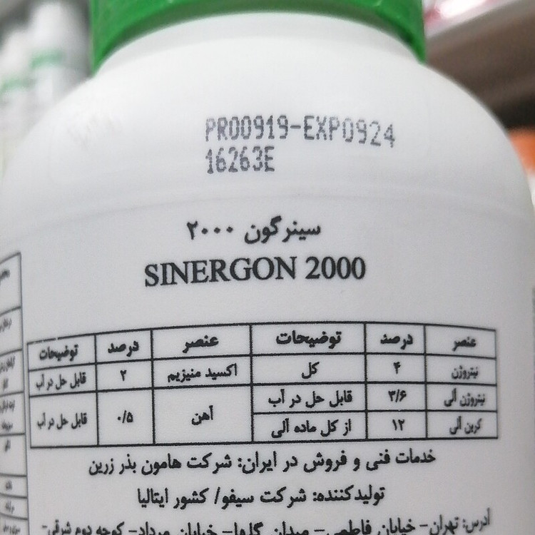 کود کشاورزی سینرگون 2000 SINERGON حاوی درصد بالا مواد آلی، منیزیم و نیتروژن جهت رنگ آوری و درشت محصول، یک لیتری ایتالیا