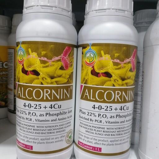 کود سم کشاورزی آلکورنین ALCORNIN ترکیب فسفیت پتاسیم همراه با مس به صورت سیستمیک و خاصیت قارچ کشی دارد، یک لیتری ، اسپانیا