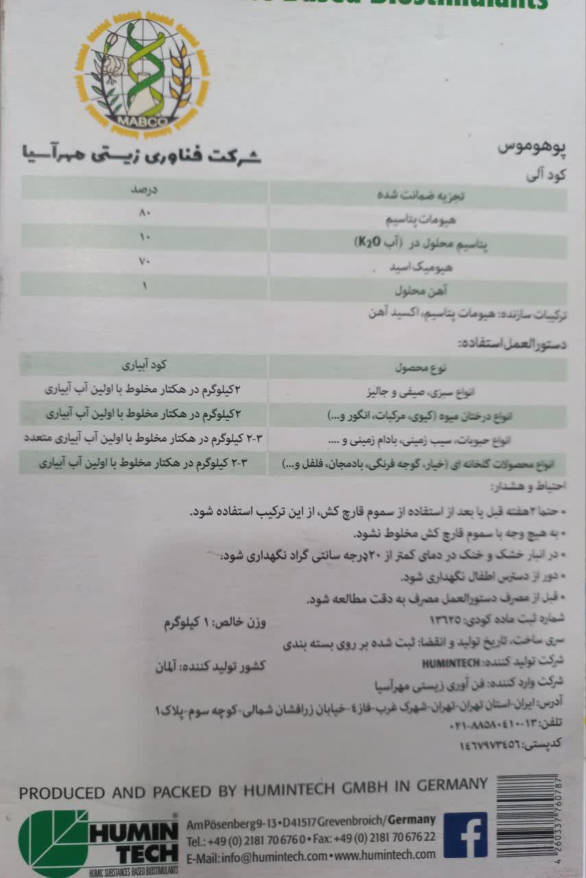 کود اسید هیومیک پوهوموس شرکت هیومین تک آلمان حاوی 70 درصد هیومیک اسید خالص و 1 درصد آهن