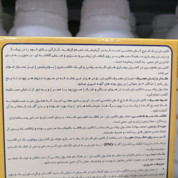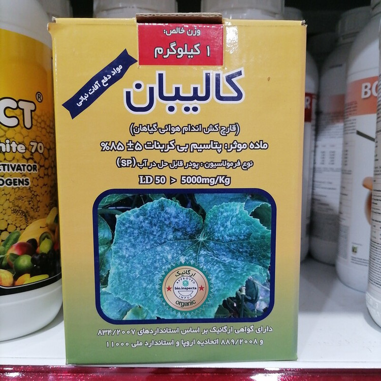 قارچ کش اندام هوایی کالیبان جهت مبارزه با بیماری سفیدک سطحی بر روی گیاهان بدون به جای ماندن اثر سمی، و همچنین کنترل بیماری لکه های سیاه رز و کپک خاکستری (بوتریتیس)، ماده موثره پتاسیم بی کربنات قابل حل در آب، بسته بندی یک کیلویی