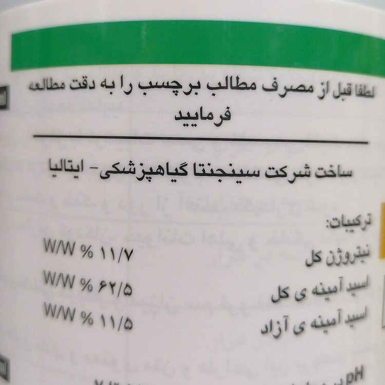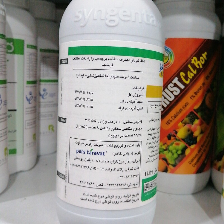 محصولی با منشا طبیعی از هیدرولیز منابع غنی آمینو اسیدی ✅افزایش مقاومت گیاه به انواع استرس (سرما، گرما، شوری، خشکی و...) ✅افزایش گلدهی و تشکیل میوه و کاهش ریزش گل ✅افزایش همسانی و همرسی میوه ✅بهبود رنگ و طعم ✅بهبود جذب ✅افزایش ریشه زایی و بهبود جذب ✅کاهش تنش انتقال نشا ✅سینجنتا ايتاليا ✅یک لیتری
